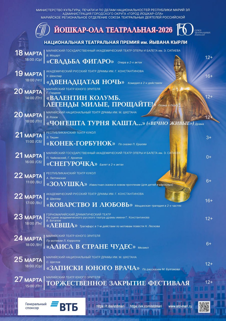 18-го марта в Марий Эл стартует одно из главных культурных событий республики – фестиваль «Йошкар-Ола театральная». Ежегодно он объединяет все театры региона. Артисты представляют премьерные постановки, оценивает которые профессиональное жюри: критики, деятели искусства.