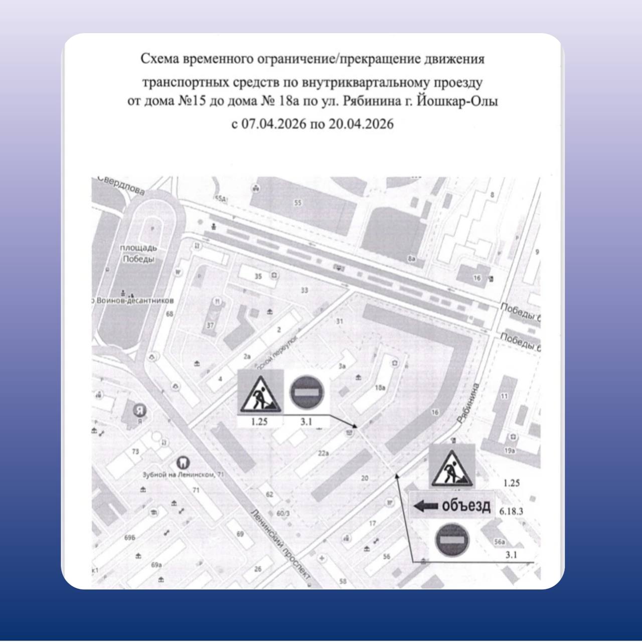 В Йошкар-Оле с 7 по 30 апреля запретят движение транспорта на улице Рябинина