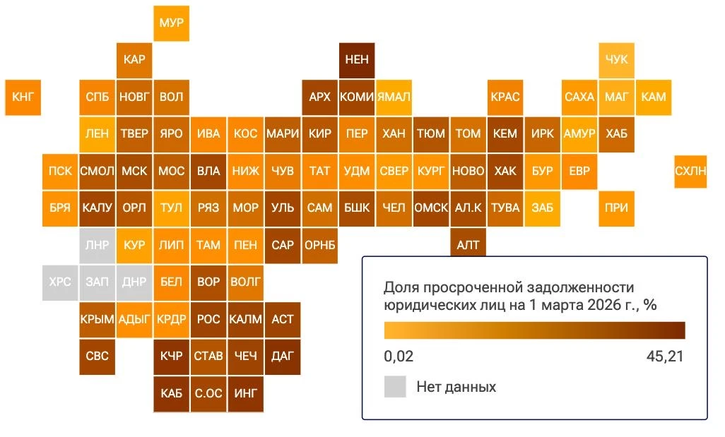 По данным на 1 марта 2026 года, доля просроченной задолженности юридических лиц составила 3,91%. По сравнению с аналогичным периодом прошлого года она уменьшилась на 1,67 п.п.