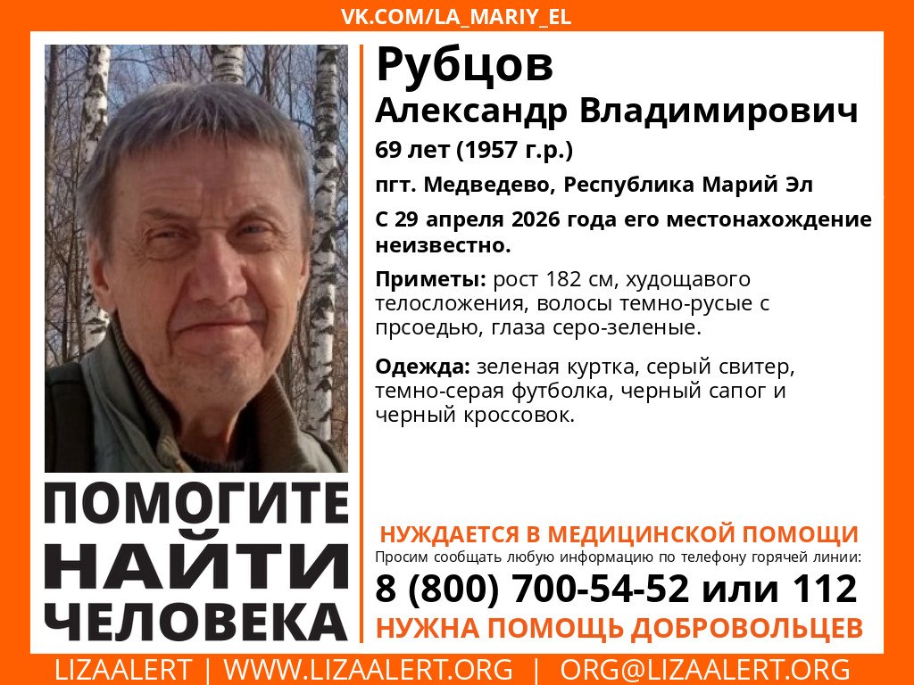Пропал #Рубцов Александр Владимирович, 69 лет , пгт. #Медведево, Республика #Марий_Эл