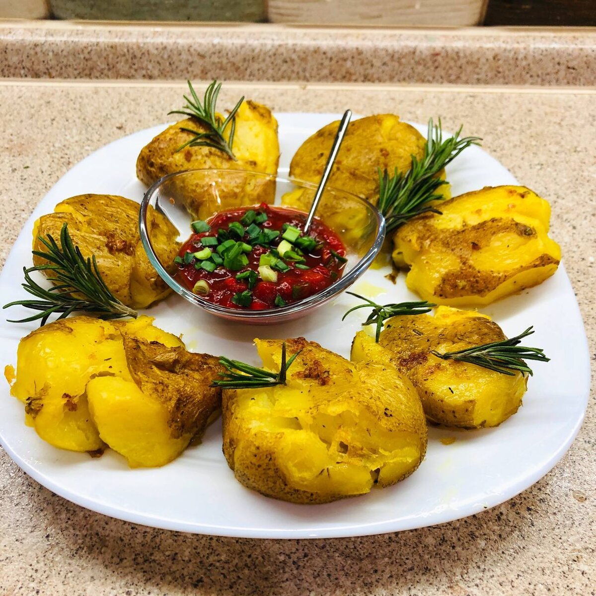 5. Обильно смазать картофель заправкой с обеих сторон и отправить в предварительно разогретую до 180 °C духовку на 20 минут. И вот, всего пять шагов, и перед вами великолепное блюдо, готовое к подаче.