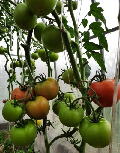 - Плоды: Томаты крупные, с большими кистями. В отличие от нижних, верхние немного мельче, но визуально это не портит картину.