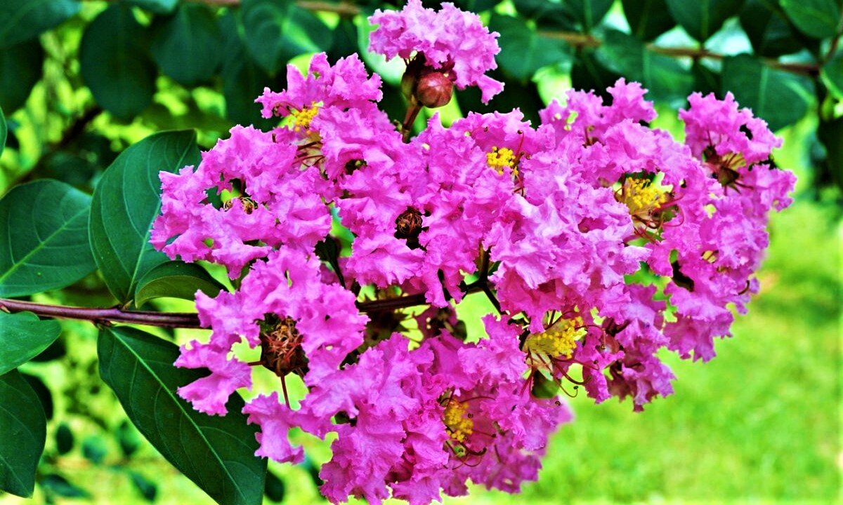 Цветение лагерстремии невозможно спутать с чем-то еще. Большие и ароматные соцветия могут иметь различные оттенки: от красного и розового до фиолетового и белого. Соцветия длиной до 40 см создают поистине захватывающее зрелище, а богатая листва с глянцевым оттенком добавляет нарядности.