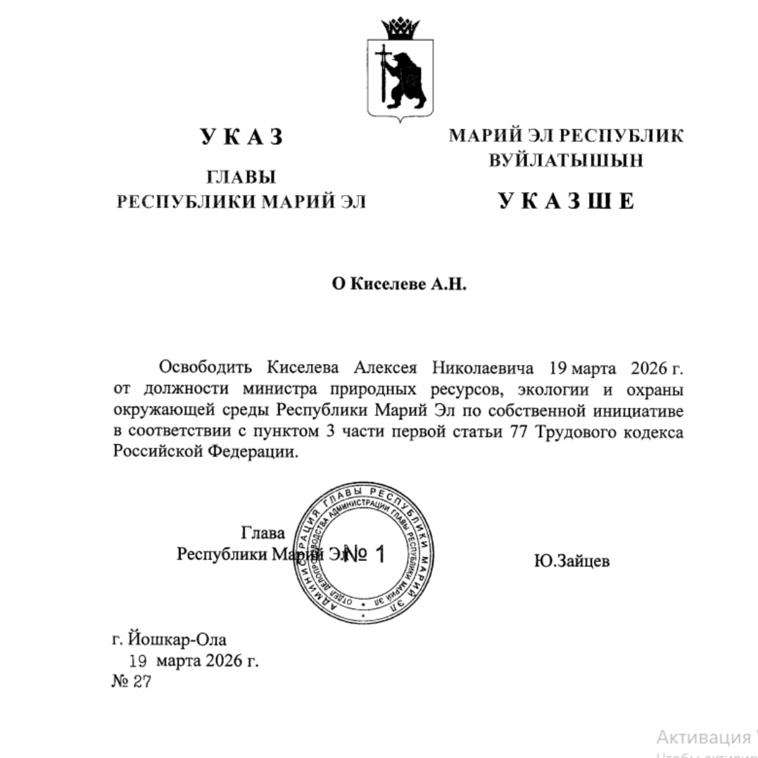 Указ об освобождении Алексея Киселева с должности министра природных ресурсов, экологии и охраны окружающей среды подписал Глава Марий Эл Юрий Зайцев.