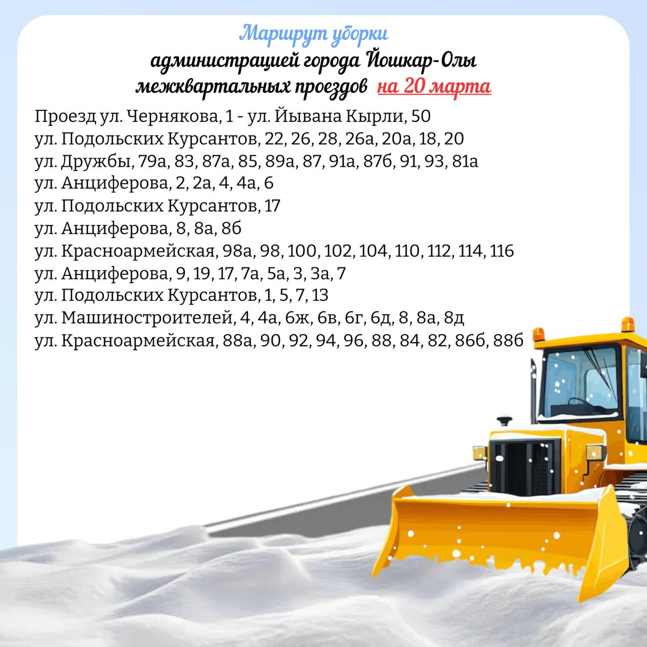 Мэрия Йошкар-Олы опубликовала планируемый маршрут движения снегоуборочной техники по расчистке межквартальных проездов на 20 марта.