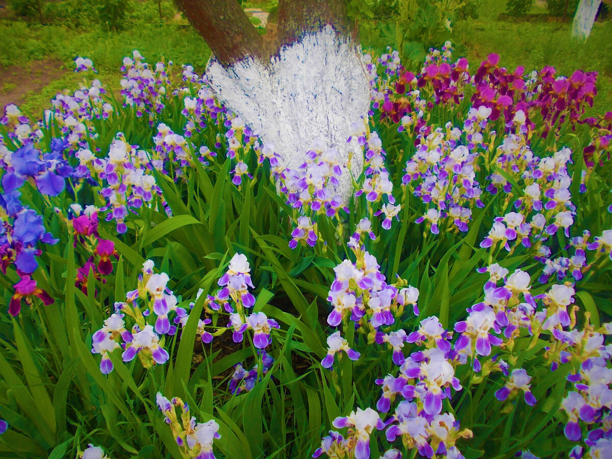 Среди первых красавиц, готовых радовать глаз, выступают ирисы. Появляясь в саду в конце весны, они изумляют своим ярким цветением. Без лишних забот, эти растения прекрасно чувствуют себя в полутени, под кронами яблонь. С их помощью можно создать потрясающее цветовое сочетание, используя желтые и фиолетовые сорта.
