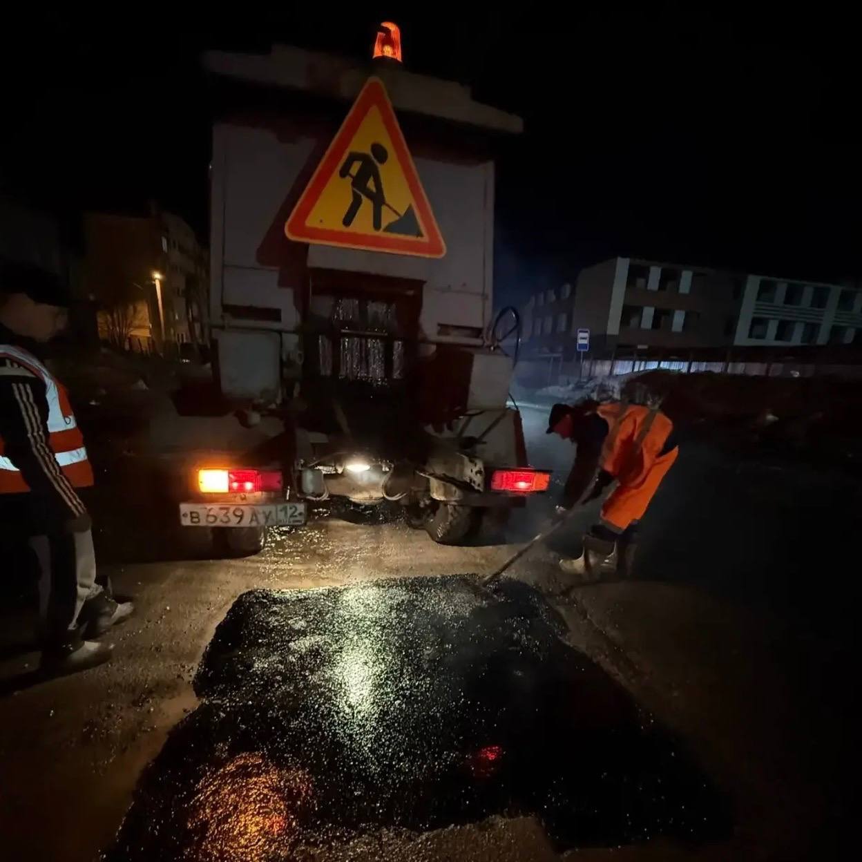 Дорожные службы АО «Город» проводят работы в ночное время, когда снижается автомобильный трафик. Для ремонта используется литой асфальт: смесь имеет высокую температуру, быстро схватывается с ремонтируемой поверхностью, не требует укатывания и перекрытия проезжей части.