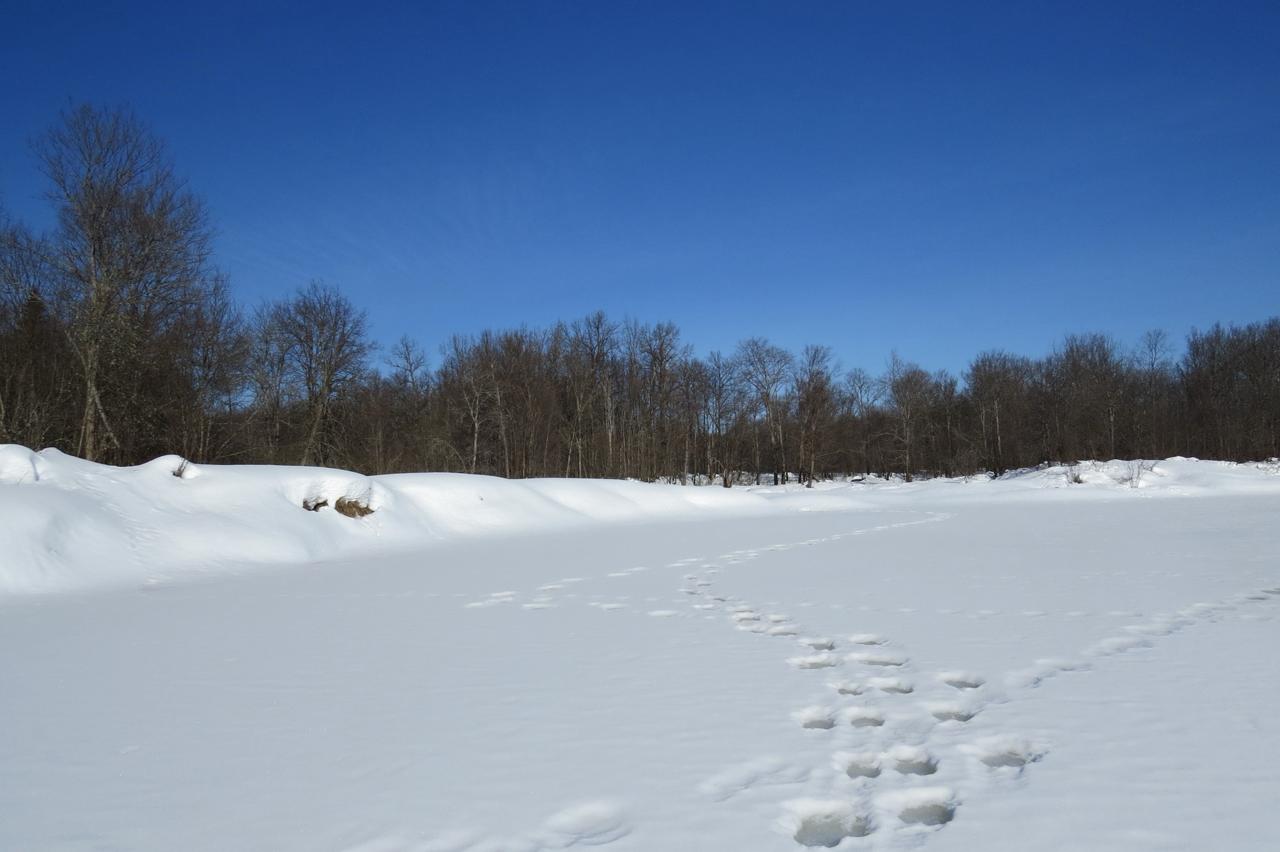 На льду одной из рек сотрудник обнаружил остатки молодой лосихи, ставшей добычей волчьей стаи. Судя по следам, в охоте участвовали три хищника, которые настигли животное у кромки льда. После трапезы волки прошли вдоль русла, оставив цепочку следов, по которой можно восстановить всю картину произошедшего.
