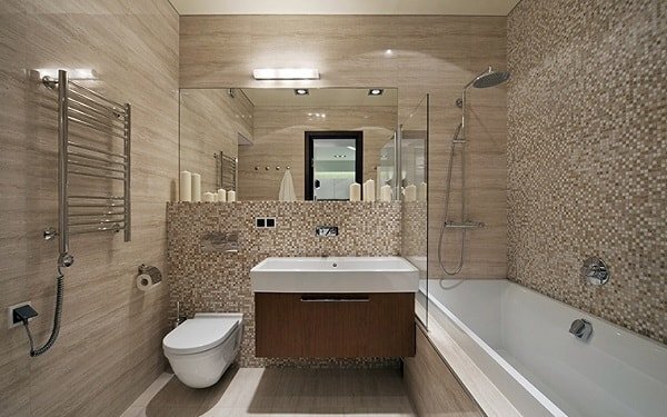 Чтобы визуально увеличить пространство, может помочь необычное расположение труб в закрытом шкафчике под раковиной или водоотводов, скрытых за унитазом. Полки и угловые решения также способствуют экономии места, а место под окном может быть использовано для низкой тумбы.