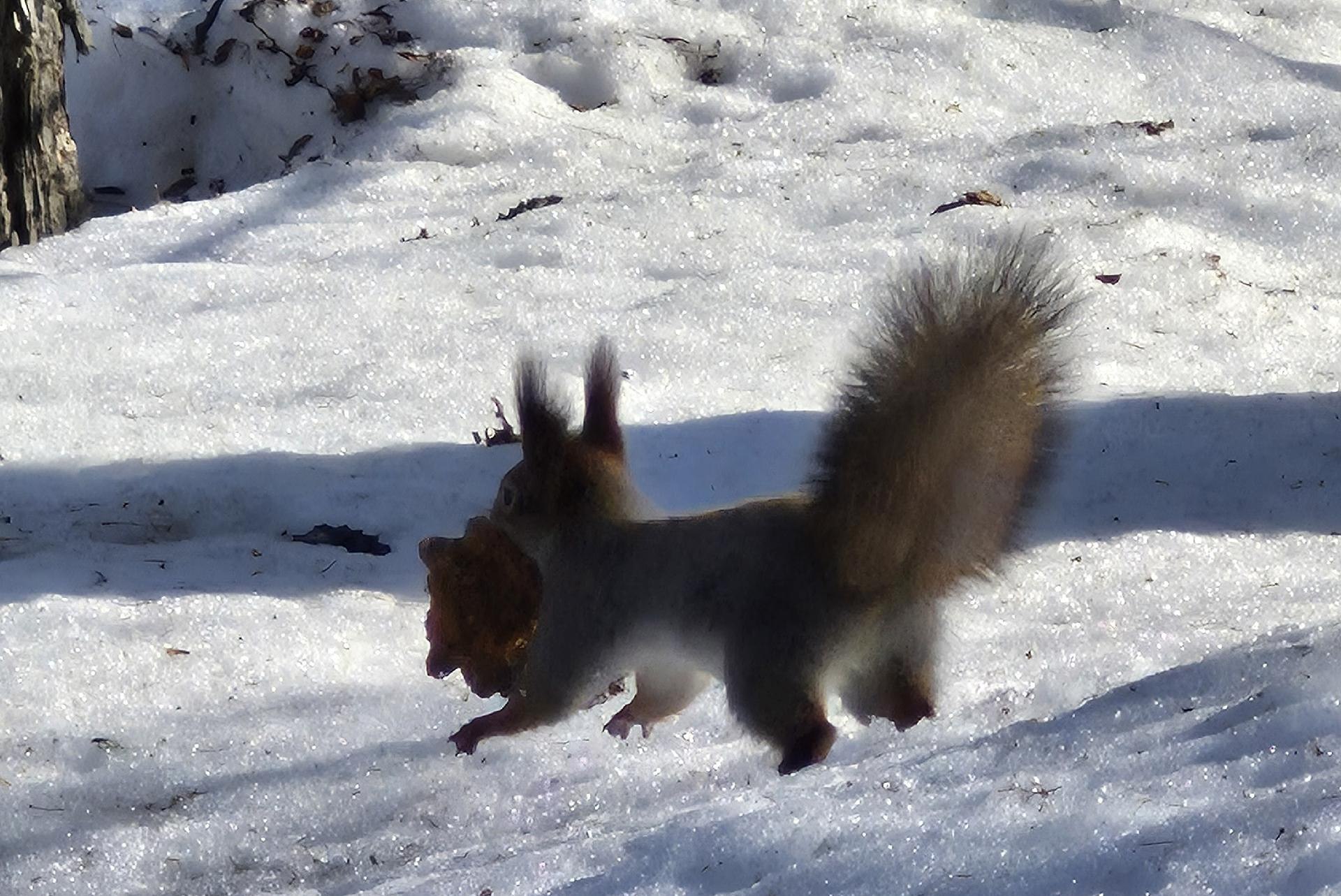 Когда снег начинает оседать и подтаивать, у белок наступает сезон «охоты» на кедровые шишки, которые всю зиму прятались в сугробах.
