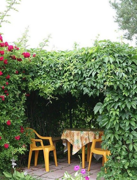 1. Натуральный навес из девичьего винограда: Создание такого укрытия не потребует особых усилий. Достаточно установить металлический каркас, который вскоре обовьёт виноград. Хоть это и долгий процесс, но плоды своего труда будут долгожданными в жаркие дни. Кроме того, девичий виноград устойчив к вредителям, что позволяет расслабиться, не беспокоясь о насекомых.