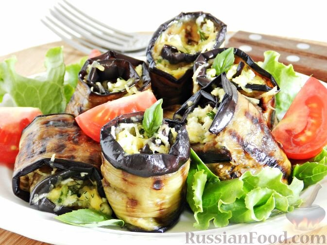 - Рулетики из баклажанов: закуска с начинкой из яиц и сыра, приправленная зеленью и чесноком — идеальный вариант для любого стола, будь то повседневное или праздничное.