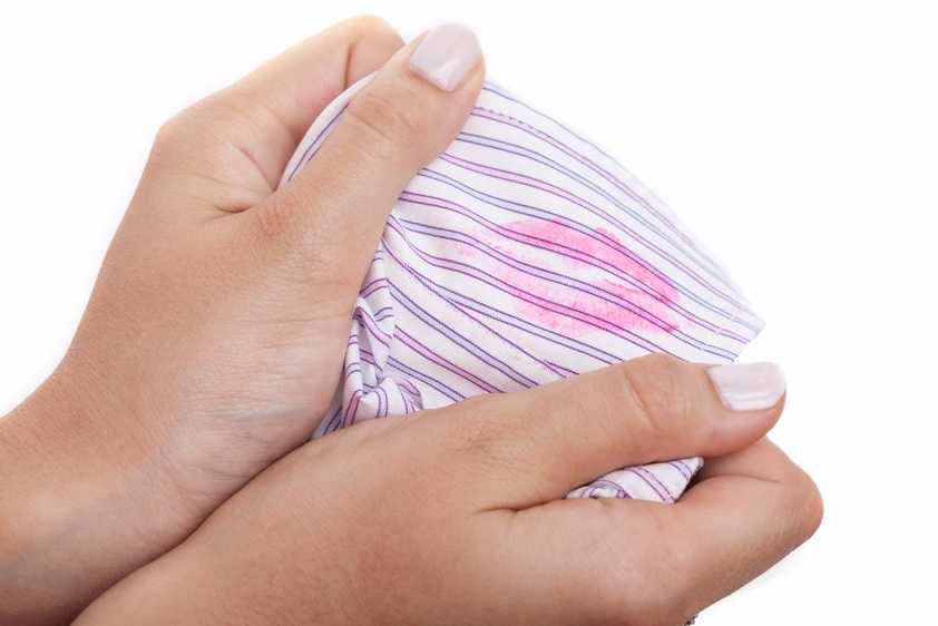 Неосторожное движение во время одевания может привести к появлению пятна от помады. Для того чтобы справиться с свежим загрязнением, рекомендуется сначала использовать тальк, который поможет абсорбировать лишний жир. Нанесите его на пятно и подождите несколько минут. Затем можно приступить к выведению пятна с помощью нашатырного спирта.