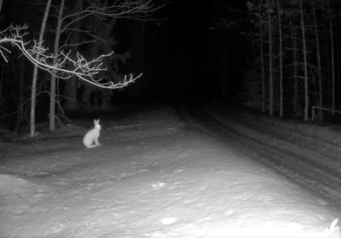 В заповеднике «Большая Кокшага» фотоловушка запечатлела, как заяц-беляк деловито обходит свои владения.