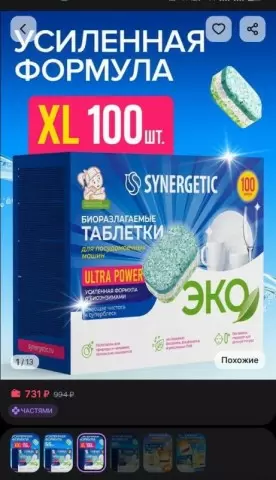 Таблетки для посудомоечных машин ULTRA POWER от бренда SYNERGETIC выделяются на фоне аналогичных продуктов благодаря своей высокой эффективностью и удобству в применении. В упаковке содержится целых 100 штук, что обеспечивает долгосрочную эксплуатацию и делает их отличным выбором для семей с активным образом жизни.