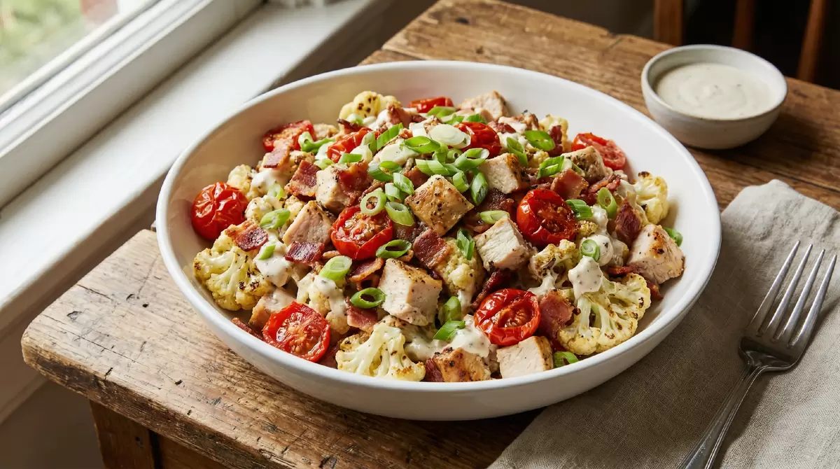 Сочный салат, в котором прекрасно сочетаются нежная курица, хрустящий бекон и цветная капуста, станет отличным решением для любого времени суток. Запечённые помидоры и сливочная заправка с горчицей делают это блюдо не только вкусным, но и сытным. Одна порция может стать полноценным обедом на полдня: в ней целых 46 граммов белка!