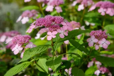 Гортензия пильчатая (Hydrangea macrophylla ssp. serrata) изначально родом из Кореи и Японии, где растёт в тенистых лесах. Этот компактный кустарник размером около 1,2 метра в высоту и ширину обладает нежными, яйцевидными листьями, длиной до 15 см, и цветками, которые могут варьироваться от розовых до голубых. Цветение продолжается с июня по октябрь, а закрасивая меняются в зависимости от кислотности почвы.
