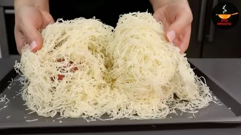 Первым делом стоит позаботиться о тесте катаифи. Его можно найти в магазинах или приготовить самостоятельно. Для начала, 50 г теста нарезают и обжаривают на сковороде с небольшим количеством масла (10 г). Обжаривать следует до золотистого оттенка, чтобы тесто приобрело хрусткую структуру и насыщенный аромат.