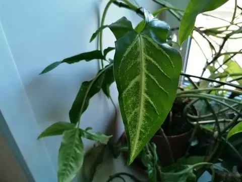 У сингониума наблюдается гетерофиллия: молодые растения имеют цельные стреловидные листья, тогда как по мере роста они трансформируются в взрослые пальчато-рассечённые формы.