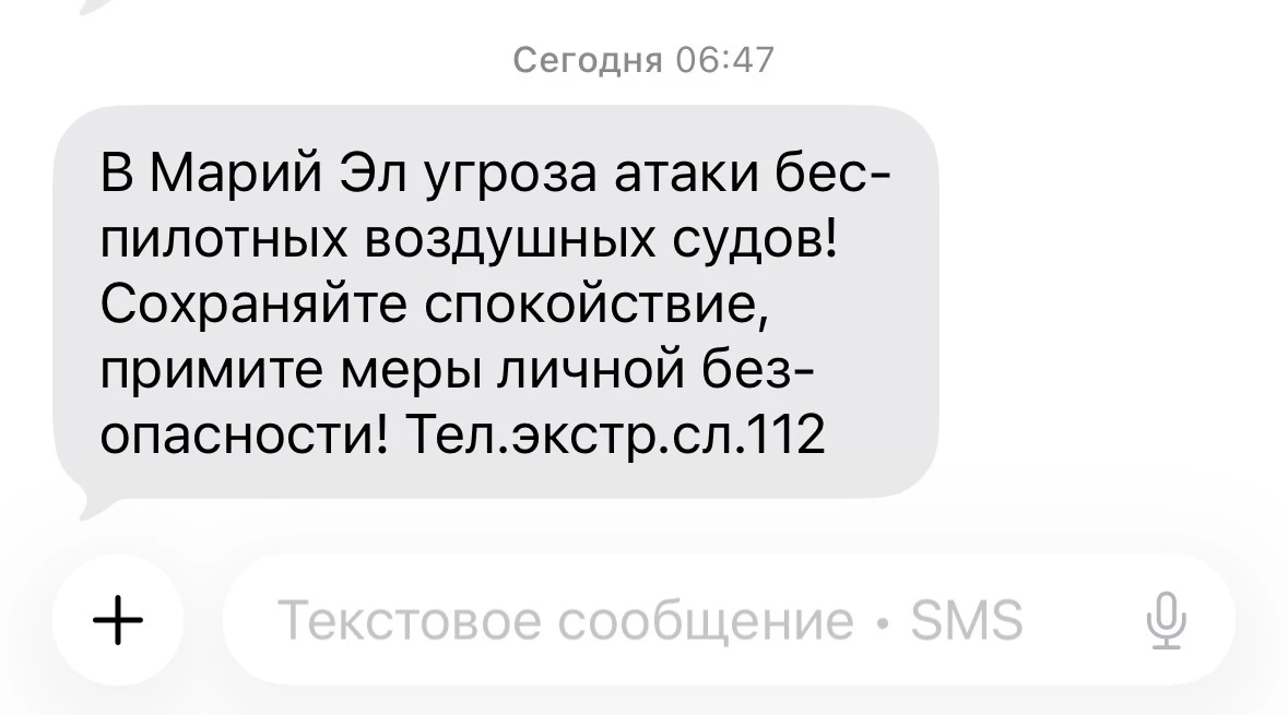 - Жителей Марий Эл предупреждают об угрозе атаки беспилотных воздушных судов. Сообщение поступило в 6:20 из регионального Комитета гражданской обороны и защиты населения. Сохраняйте спокойствие. Телефон экстренных служб – 112.// Марийская правда
