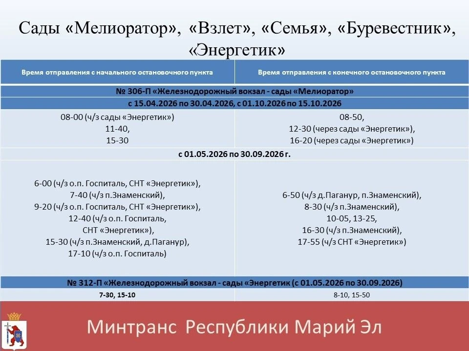 Близится начало дачного сезона и вот-вот жители Йошкар-Олы поедут на свои дачи, чтобы готовить их к лету. Минтранс опубликовал расписание движения автобусов до 8 СНТ.