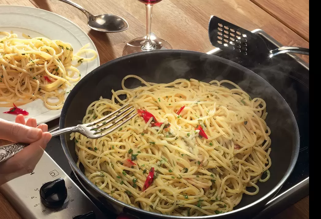 Ключ к успеху этого блюда заключается в времени: чеснок и перец не должны пригорать, а спагетти впитывают аромат масла и специй. Подавайте блюдо горячим, без тертого сыра — готовое произведение искусства сведите к минимуму, добавив лишь дольку лимона и бокал белого вина.
