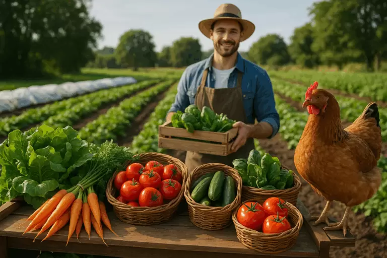 Проект включает в себя широкую линейку продукции: свежие овощи (например, огурцы, помидоры и перцы), зелень (укроп, различные сорта салатов, микрозелень), а также куриное мясо и яйца. Предполагается использование арендованной площади в 20 соток, с теплицей площадью 150 квадратных метров, что позволит эффективно развивать как закрытое, так и открытое земледелие, а также курятник на 100 птиц.