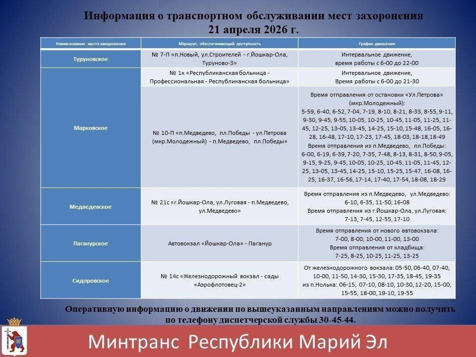 В связи с этим жителям Йошкар-Олы рассказали, как добраться до городских кладбищ. Например, на Туруновское можно уехать на автобусе №7П, на Марковское — на маршрутке №1К и автобусе №10П, на Медведевское — на маршрутке №21С, на Паганурское — на автобусе «Йошкар-Ола — Паганур» и на Сидоровское — на автобусе №14С «Ж/д-вокзал — сады "Аэрофлотовец-2».