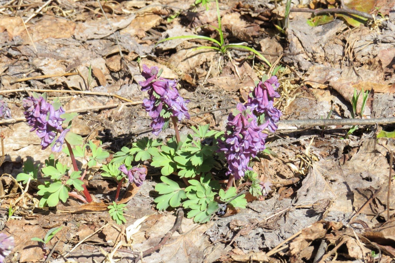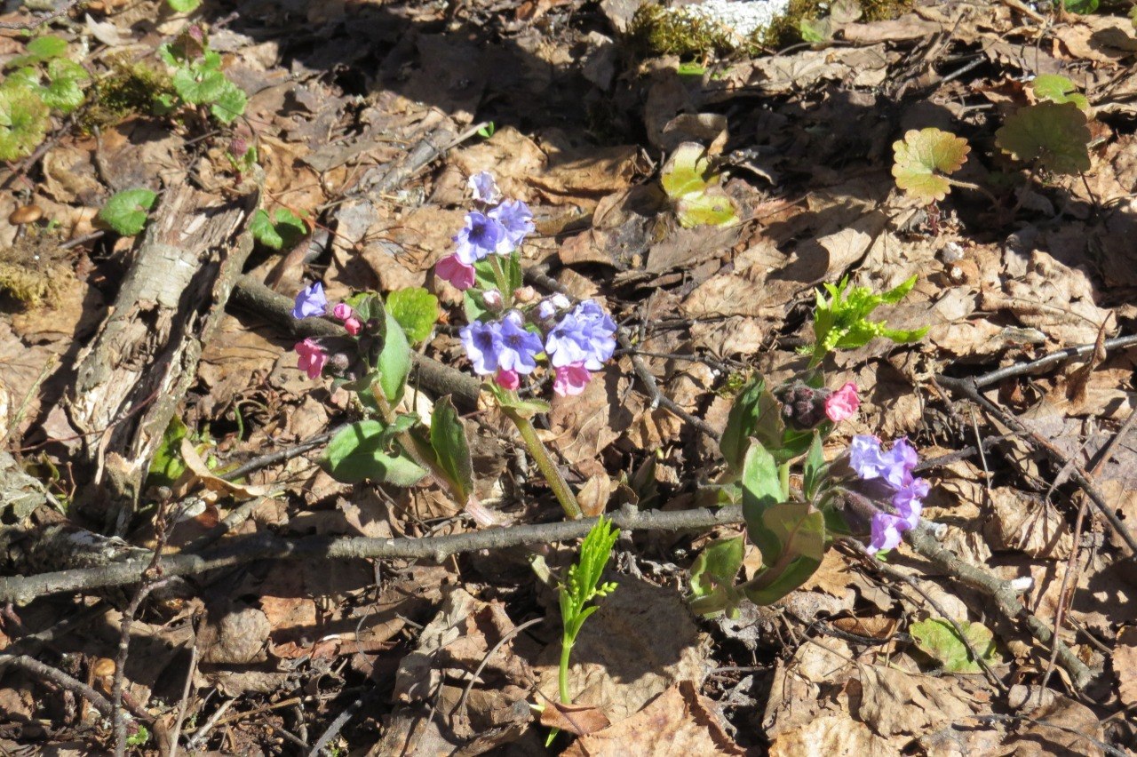 Медуница продолжает радовать глаз необыкновенным цветением, а хохлатка плотная раскинулась сиреневыми коврами на опушках.