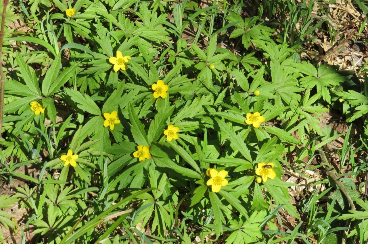 На лесных полянках появились нежные ветреницы лютиковидные. Их ярко-жёлтые цветы напоминают маленькие солнышки.