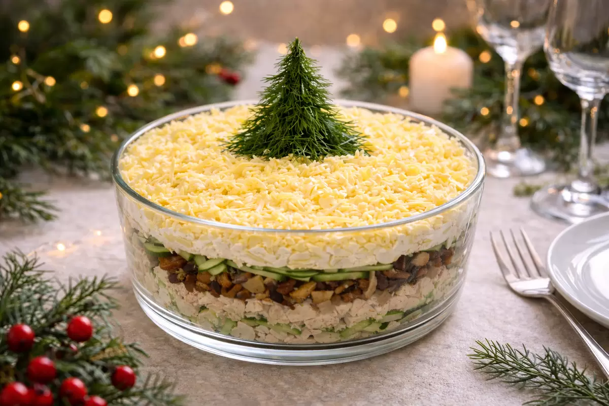 На каждом новогоднем столе есть тот единственный салат, который исчезает в первую очередь, и вокруг него всегда собираются все гости, шепчущиеся о рецепте. Представляем вашему вниманию «Новогодний фаворит»! Это уникальное сочетание нежной курицы, ароматных шампиньонов, свежих огурцов и тягучего сыра создаёт настоящий праздник вкуса. Простой, сытный, и при этом лёгкий салат, который уже много лет завоёвывает сердца на праздниках.