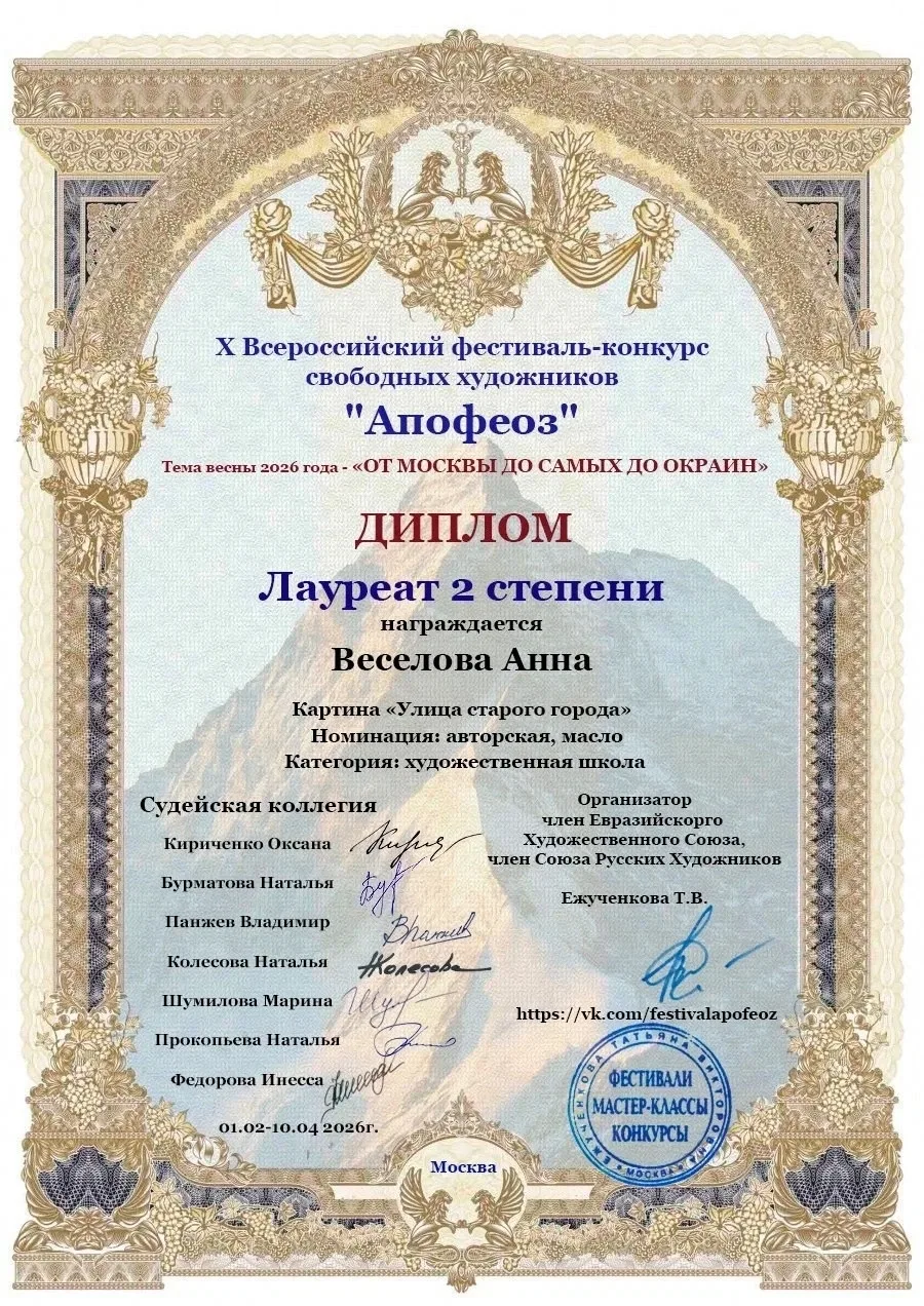 Студентка 2 курса специальности «Живопись» Йошкар-Олинского художественного училища Анна Веслова стала лауреатом второй степени Всероссийского фестиваля свободных художников «Апофеоз» в конкурсе «От Москвы до самых окраин».