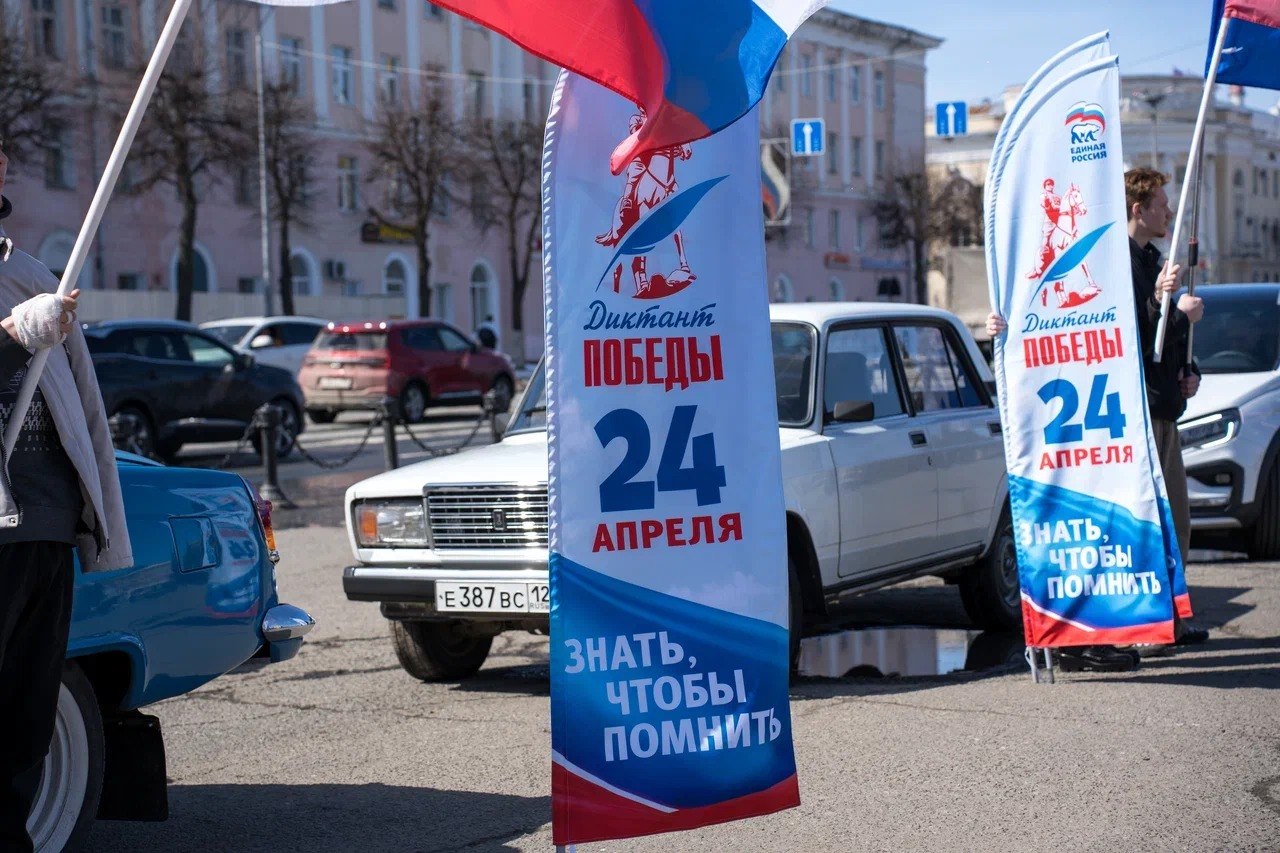 Автоколонна, украшенная флагами России и Республики Марий Эл, после официального старта на площади Ленина проехала по улицам Йошкар-Олы, привлекая внимание горожан к предстоящему «Диктанту Победы».