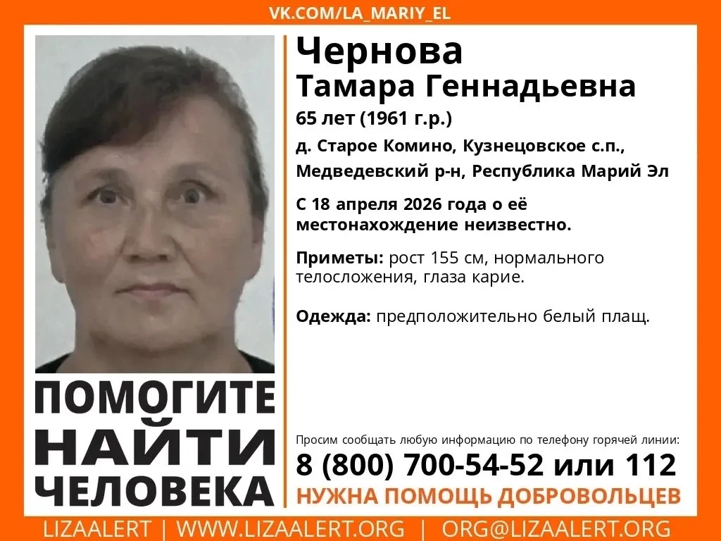 С 18 апреля года неизвестно местонахождение жительницы деревни Старое Комино Тамары Черновой.