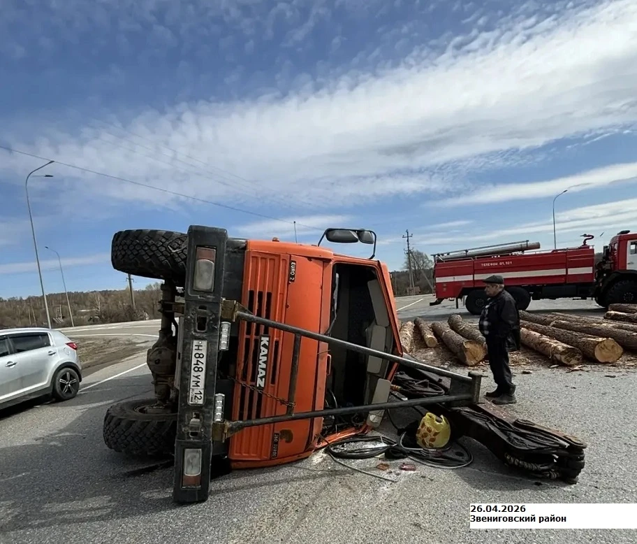КамАЗ с бревнами опрокинулся на трассе в Звениговском районе Марий Эл