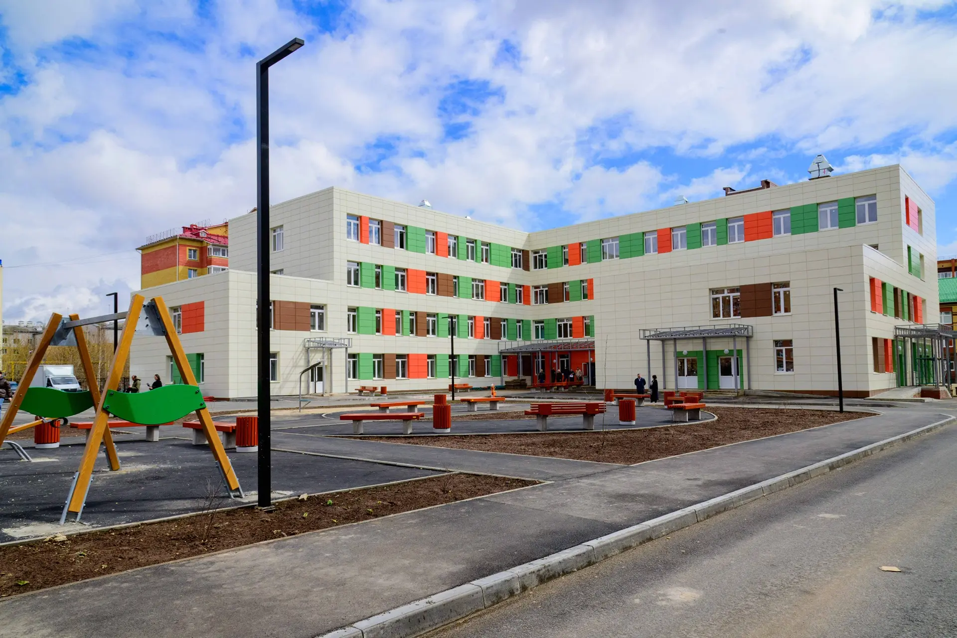Проект предусматривает комплексное благоустройство прилегающей территории, включая парковку на 40 машиномест, детскую площадку, зоны отдыха, инфраструктуру для маломобильных граждан, озеленение и ограждение территории. На текущий момент работы по благоустройству близки к завершению. Внутренние работы в здании также выполнены. Завершается чистовая отделка помещений и установка инженерных систем.